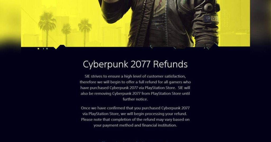 Entra Sony. Están recibiendo cientos de solicitudes de reembolso para este juego en su tienda digital y no están contentos con ello. Según su política de reembolso, puedes obtener un reembolso dentro de los 14 días posteriores a la compra del juego, lo que también se aplica si lo reservaste al menos 14 días antes de su fecha de lanzamiento. Teniendo en cuenta que hubo 8 millones de pedidos anticipados, creo que eso incluye a la mayoría de las personas que compraron el juego. El problema es que todos los jugadores que compraron el juego fuera de ese período no pueden obtener un reembolso, y se les debe uno dado el estado del juego.